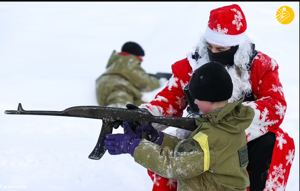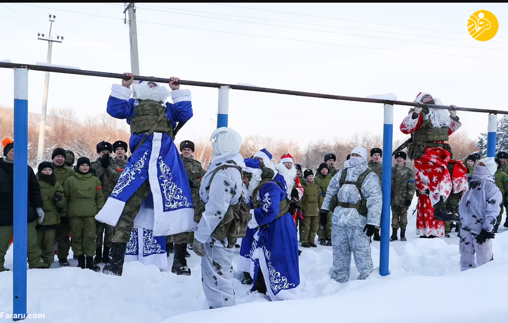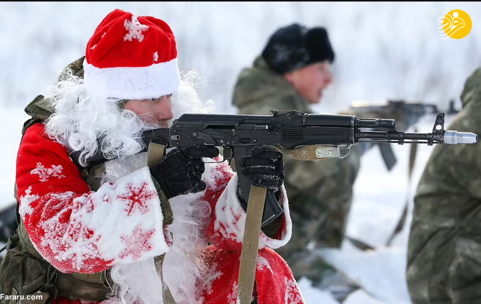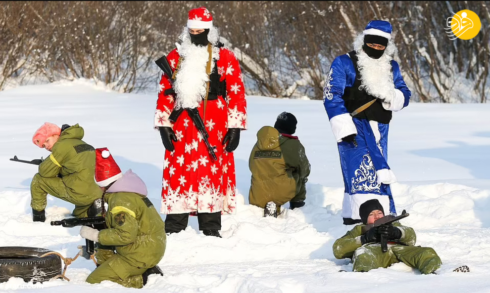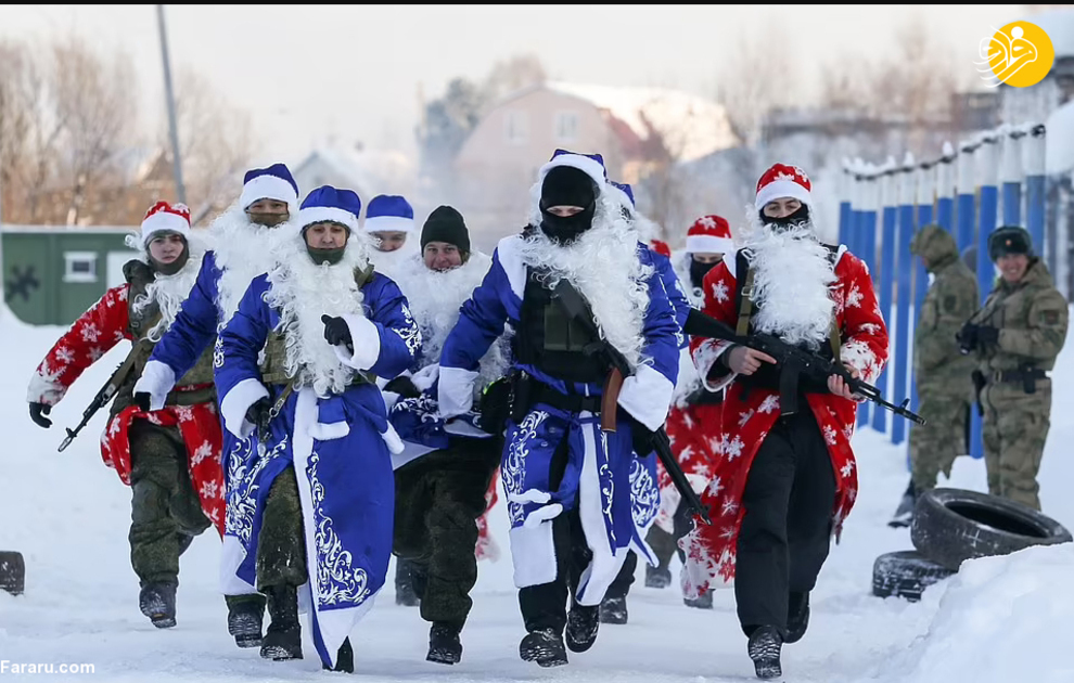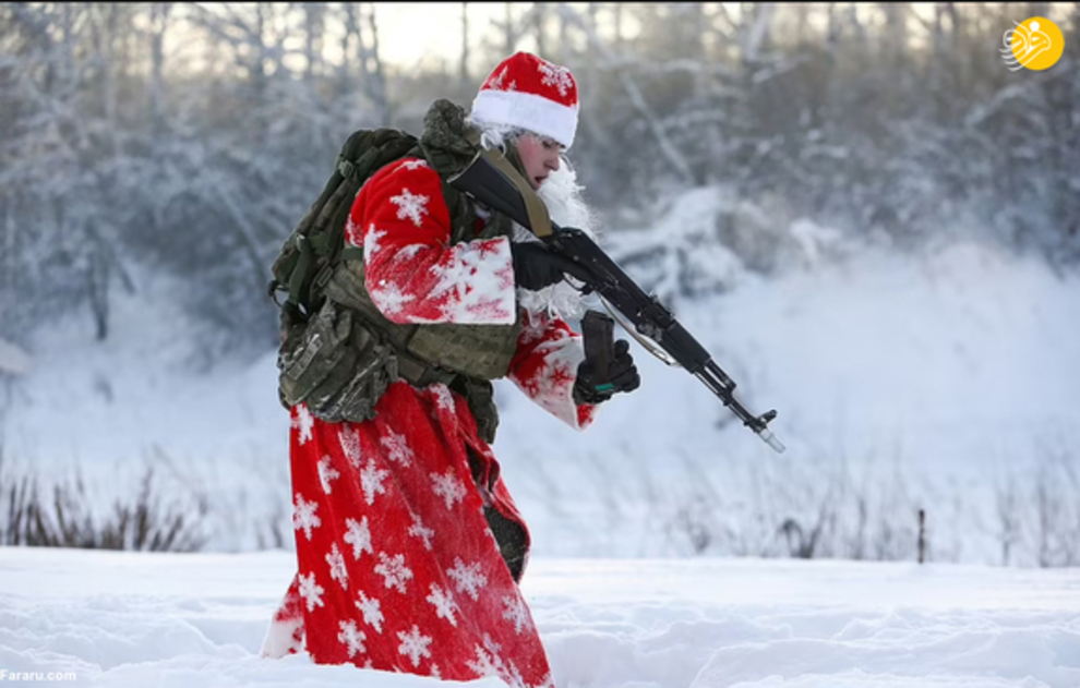 نیروهای گارد ملی روسیه در جریان یک تمرین نظامی لباس بابانوئل به تن کرده و با تفنگهای خود شلیک کردند. بابانوئل در روسیه به پدر موروز معروف است، شخصیتی شبیه بابانوئل که معمولا لباسهای قرمز و گاهی آبی میپوشد. این رزمایش در سیبری برگزار شد.