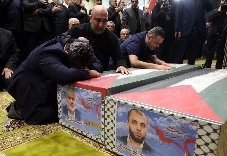 مخاطب ۲۴- در جریان مراسم تشییع شهید اسماعیل هنیه و محافظش که در تهران ترور و شهید شدند، پسران رئیس دفتر سیاسی جنبش حماس بر تابوت پدرشان گریه کردند. در ادامه تصاویری از وداع پسران هنیه با پدرشان را مشاهده میکنید.