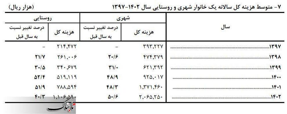 هزینههای سالانه خانوار شهری و روستایی در مقایسه با پایان سال ۱۳۹۹ به ترتیب ۲۳۲ و ۲۲۴ درصد افزایش داشته است؛ به بیان دیگر هزینههای یک خانواده شهری و روستایی در سال ۱۳۹۹ به طور میانگین در هر ماه، حدود ۵ و ۳ میلیون تومان بوده است ولی در سال ۱۴۰۲ به ترتیب ۱۷ و ۹ میلیون تومان شده است. سهم خوراکی و غیرخوراکیها در سبد هزینههای خانوادهها