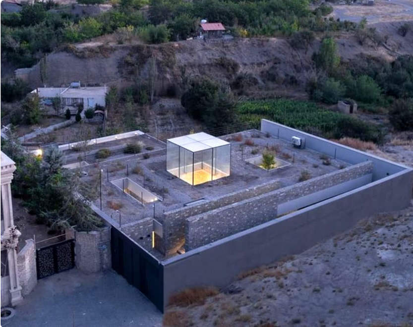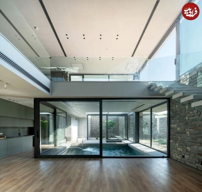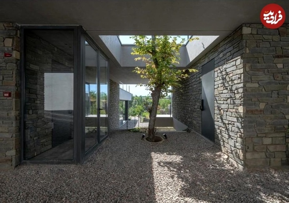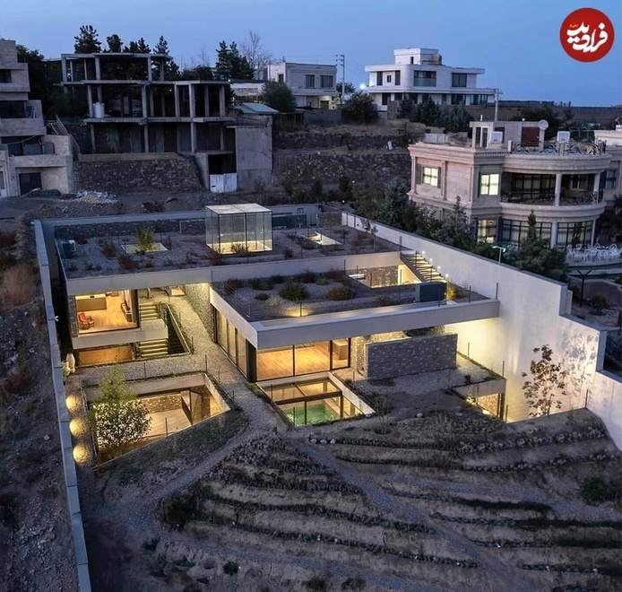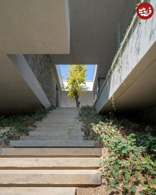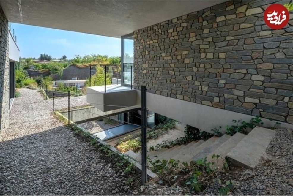 اما ویژگی مهمتر این ویلا ترکیب زیبا و شگفتانگیز «درون و بیرون» است. این ویلا در حقیقت ترکیبی از زندگی روی زمین و زیر زمین است. چشمانداز کلی پروژه نشان میدهد که بخش عمدهای از آن به یک معنا در زیر سطح زمین قرار گرفته است، اما در عین حال شیب زمین و طراحی ساختار بنا به گونهای است که وقتی در درون ویلا هستید، نه تنها خود را در زیر سطح احساس نمیکنید، بلکه حتی چشماندازی گسترده نیز در پیش روی شما قرار دارد.